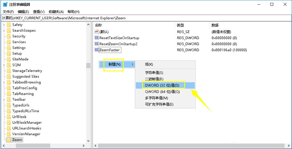 5、在zoom項次右側(cè)空白處點擊鼠標右鍵---新建--REG_DWORD值,如下圖所示