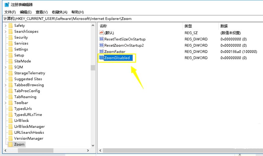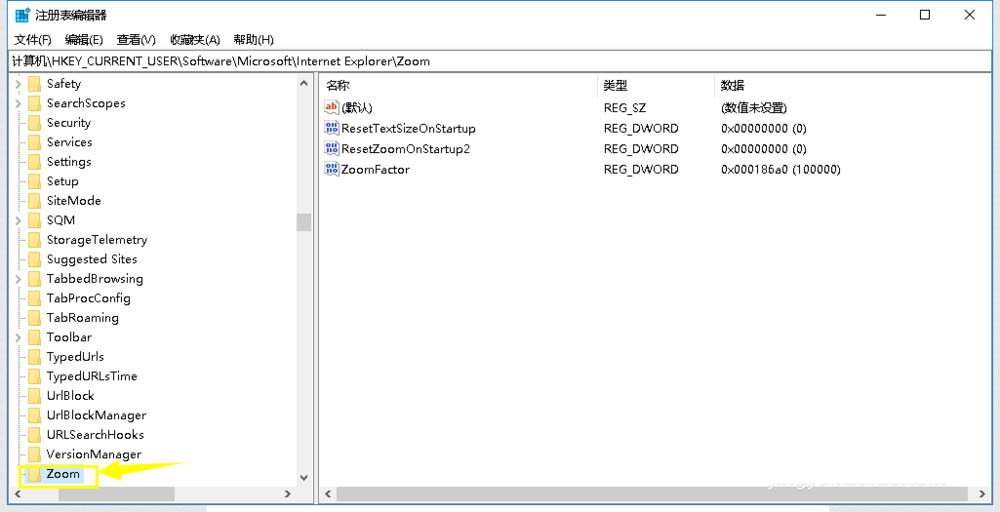 4、進入注冊表,按下列路徑進入,HKEY_CURRENT_USER/Software/Microsoft/Internet Explorer/Zoom,如下圖所示