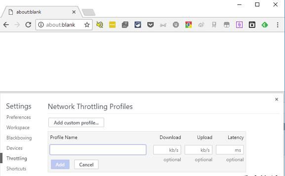 接著點(diǎn)擊「Add custom profile…」來添加新的配置,在里面輸入配置的名稱、下載速度、上傳速度以及延遲,再點(diǎn)「Add」就可以了,這樣你就生成了一個速度配置。你可以生成多個速度配置,不同需求時就使用不同的配置。