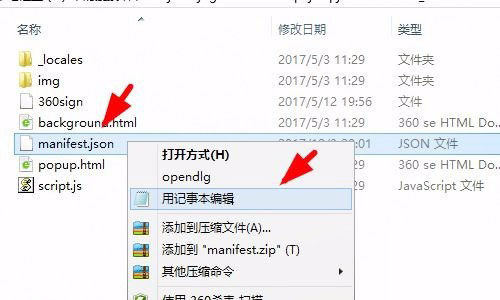 4、將地址保持之后接著右鍵單擊其中的manifest.json文件,使用記事本將它打開