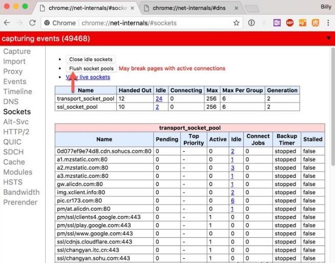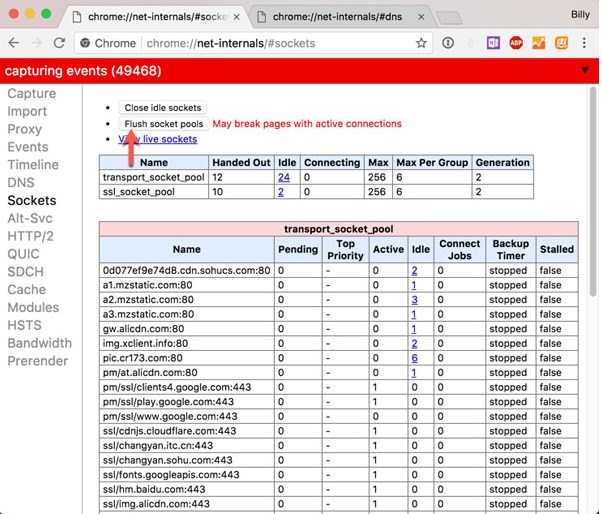4、根據結果,可能還需要刷新套接字緩存。 執行下面的 URL 以訪問 sockets 頁面:chrome://net-internals/#sockets
