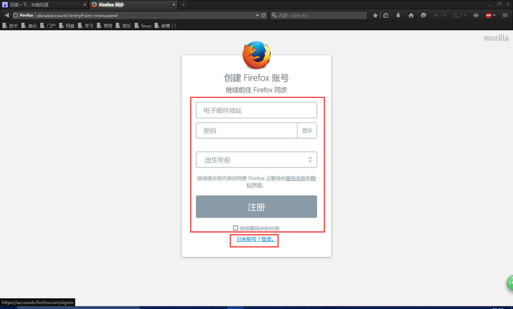 5、如果你之前沒有火狐的賬號,那么在這里可以注冊一下,此處選擇下面的”已有帳號?登錄“,如圖所示