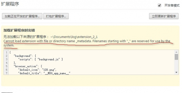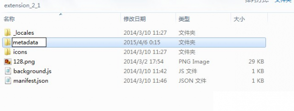 7.出現這種情況Chrome瀏覽器會提示無法加載以下來源的擴展程序: xxx路徑(Chrome插件文件的解壓位置)Cannot load extension with file or directory name _metadata. Filenames starting with "_" are reserved for use by the system.出現這種情況,是因為這款Chrome插件與新版的Chrome瀏覽器有些不兼容,這時候,用戶可以打開剛剛解壓的Chrome插件文件夾,并把其中_metadata文件夾的名字修改為metadata(把前面的下劃線去掉),如圖所示: