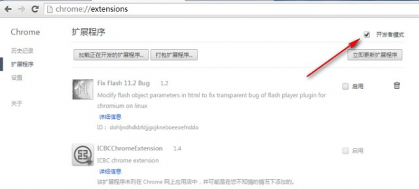 4.在Chrome的地址欄中輸入:chrome://extensions/ 打開Chrome瀏覽器的擴展程序管理界面,并在該界面的右上方的開發者模式按鈕上打勾,如圖所示:
