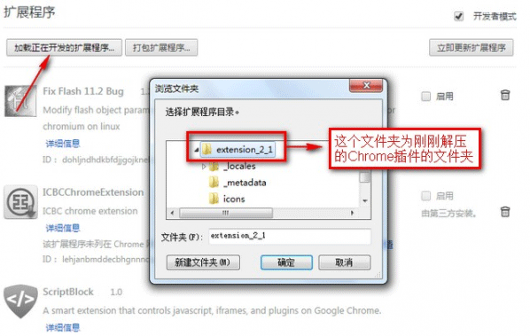 5.在勾選開發者模式選項以后,在該頁面就會出現加載正在開發的擴展程序等按鈕,點擊“加載正在開發的擴展程序”按鈕,并選擇剛剛解壓的Chrome插件文件夾的位置,如圖所示: