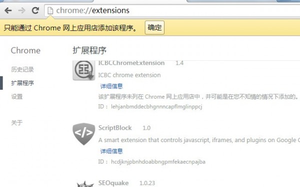 但是,由于一些特殊原因,極個別Chrome插件在使用上述的安裝方法的時候,Chrome會提示“只能通過Chrome網上應用商店安裝該程序”,如圖所示: