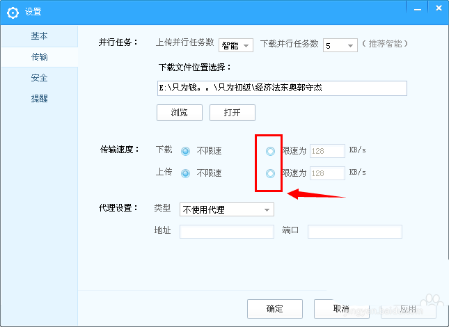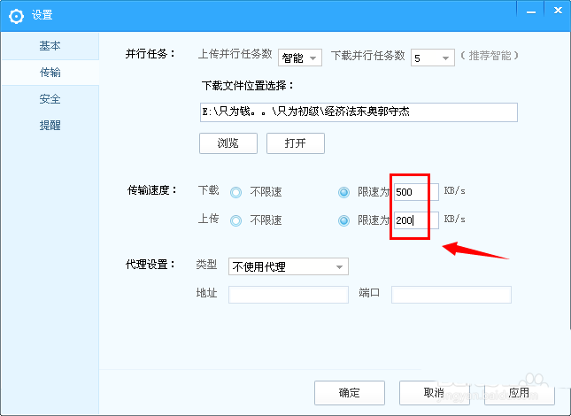 5、然后在這里設置下載和上傳速度,比如下載速度設置為500KB/s,上傳速度設置為200KB/s,點擊“確認”就可以了