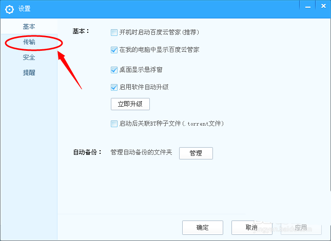 3、在百度云管家的設置里面我們找到”傳輸“選項,如圖紅圈所示的位置