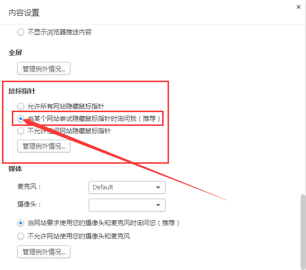 6、跳出內(nèi)容設(shè)置界面往下拉找到【鼠標(biāo)指針】中的【當(dāng)某個(gè)網(wǎng)站嘗試隱藏鼠標(biāo)指針時(shí)詢問(wèn)我】前面打上點(diǎn),最后點(diǎn)擊【完成】就好了。