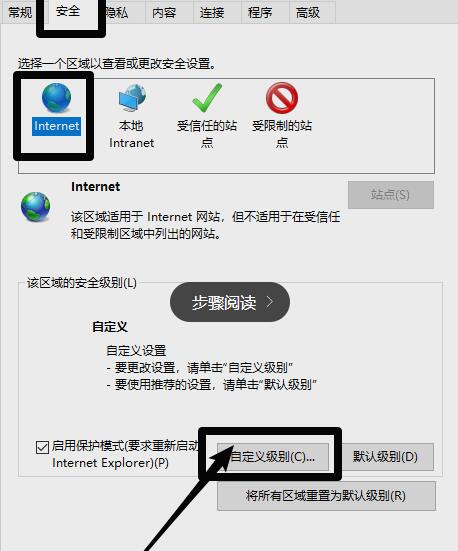 2、進(jìn)入Internet選項(xiàng),切換到【安全】—【Internet】—【自定義級(jí)別(C)】;如圖所示