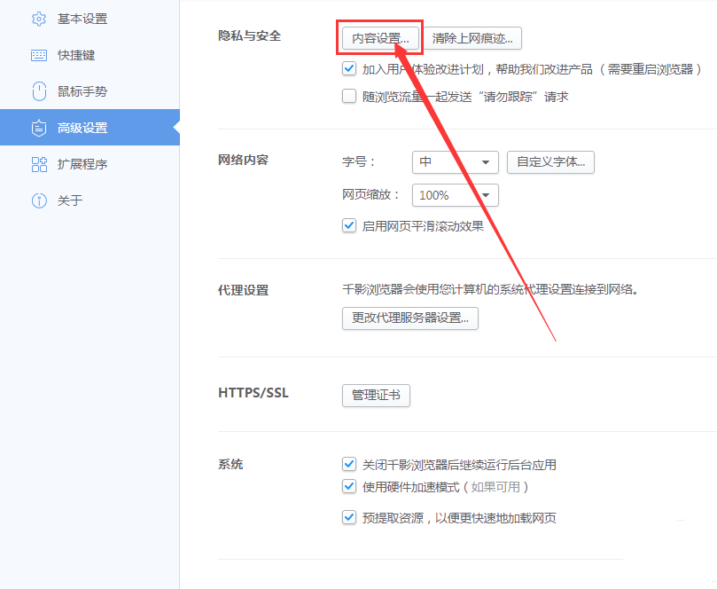 5、在跳出高級設置界面找到【內容設置】點擊進入