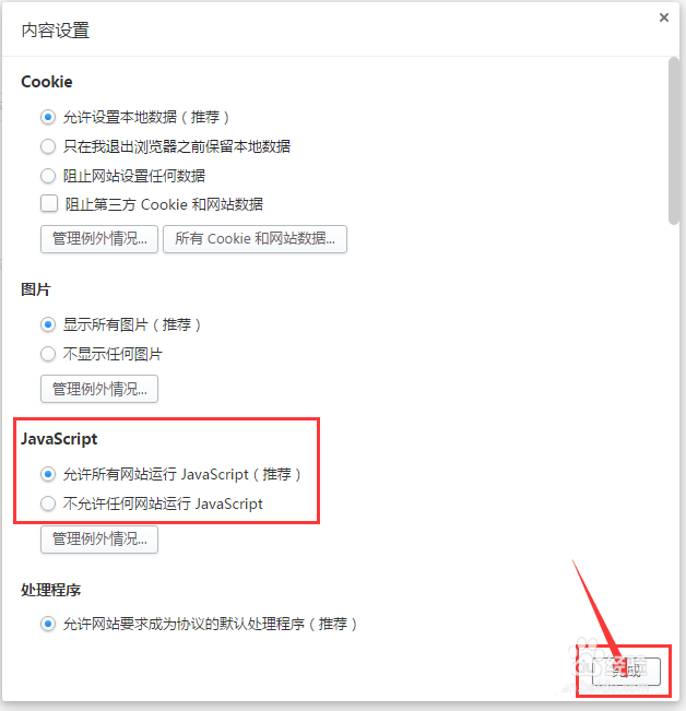6、跳出內容設置界面找到【JavaScript】點擊你想設置的前面點上點,最后點擊【完成】