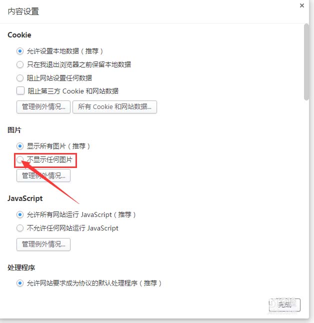 5、在內(nèi)容設(shè)置跳出界面中的不顯示圖片前面點上綠點,點擊【完成】。如下圖片中所示