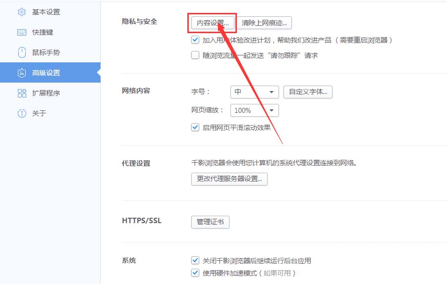 4、點一下右邊的“隱私與安全”中的“內(nèi)容設(shè)置”,如下圖片中所示