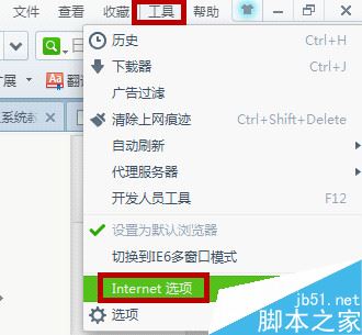 進入瀏覽器的“工具”,這時候的菜單選項中,點擊“internet”選項。