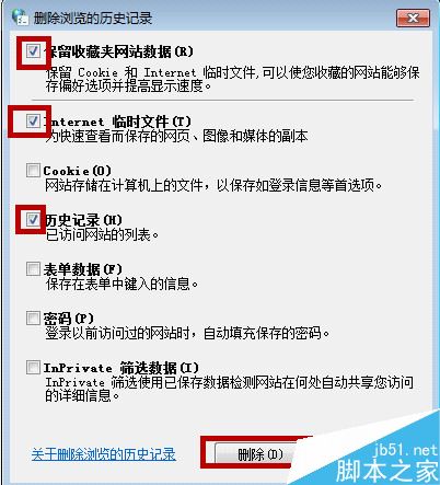 在出現的“刪除瀏覽的歷史記錄”中選中如圖所示的幾個選項,點擊“刪除”(注意,如果你不需要你的cookie、電腦記住的密碼、以及一些表單的話,也可以勾上,但是為了你方便地利用以前的數據,建議不要刪除)