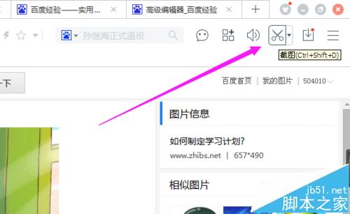 1、打開百度瀏覽器,找到目標圖片,在瀏覽器右上角有一個剪刀符號,點一下,就可以截圖了。