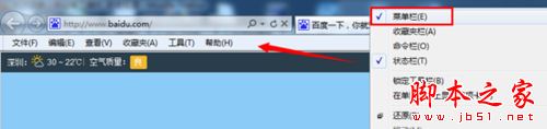 在IE空白區(qū)域右鍵勾選“菜單欄”項(xiàng)目,如下圖。勾選之后,就能顯示出來(lái)了