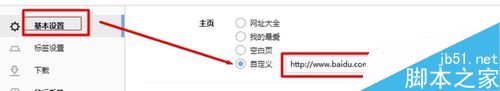 找到“基本設(shè)置”——“主頁”,選擇“自定義”,并且輸入你想設(shè)置為主頁的網(wǎng)址。比如,我設(shè)置百度為首頁。如下圖。
