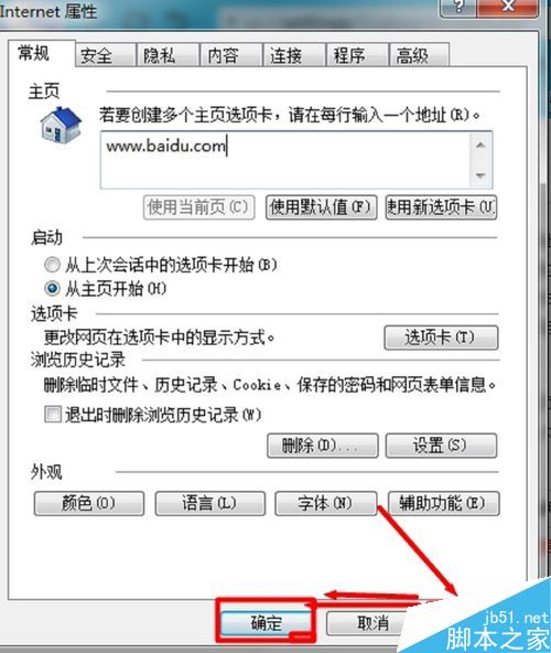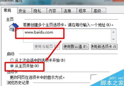 在Internet屬性對話框,把主頁改為剛才您設(shè)置的網(wǎng)址。并且選擇“從主頁開始”。
