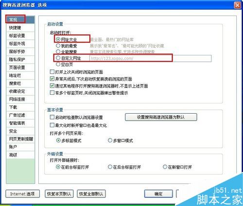 在打開頁面的常規(guī)里,看到啟動(dòng)設(shè)置,默認(rèn)是選擇第一個(gè),我們點(diǎn)擊一下“自定義網(wǎng)址”:
