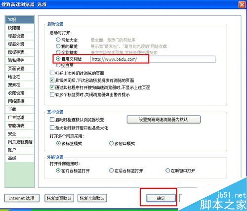 把自定義網(wǎng)址里的網(wǎng)址修改為你想要的,比如百度首頁,再點(diǎn)擊確定: