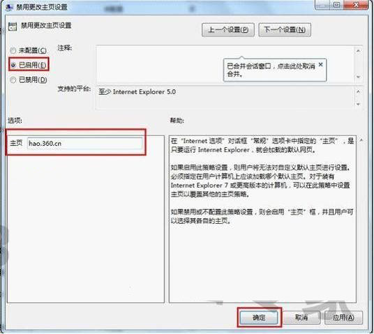 3.設(shè)置【已啟用】,并設(shè)置您需要的主頁確定即可。