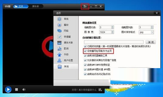 方案三:如果安裝了快播軟件,可以嘗試修改快播的設(shè)置,去掉勾選設(shè)快播網(wǎng)址導(dǎo)航作為主頁。