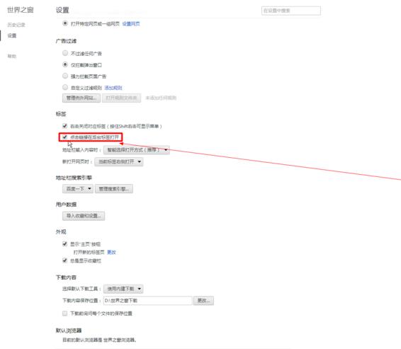 6、再打開標簽頁就可以自動跳轉了,如果你想讓他不自動跳轉就把那個“點擊鏈接在后臺標簽打開”前的勾打上!
