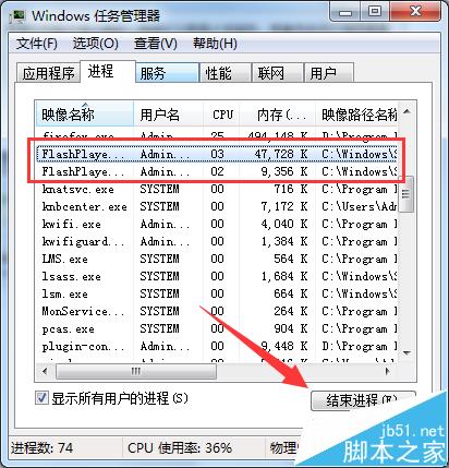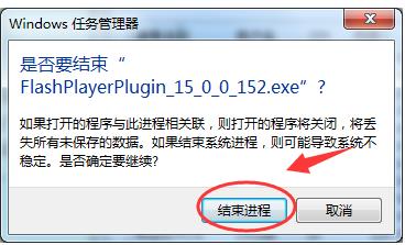 windows任務管理器對話框,找到flash player.exe進程。點擊“結束進程”