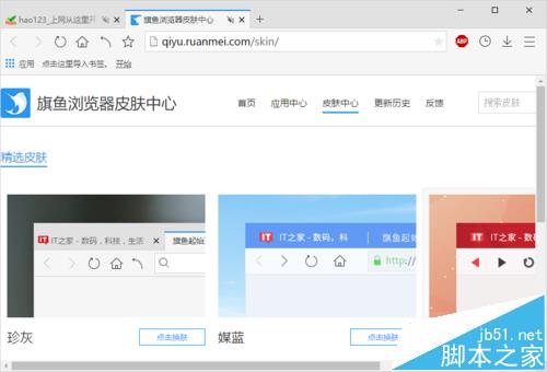 4、點擊“皮膚”命令選項后,這個時候會彈出瀏覽器“皮膚中心”對話框。如圖所示;