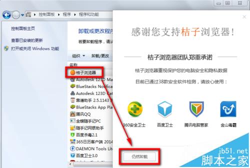 3、在卸載程序中找到桔子瀏覽器,雙擊鼠標左鍵會彈出窗口,我們選擇仍然卸載。
