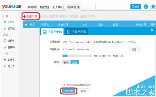 2、打開優酷客戶端——視頻管理——點擊新建下載。然后下載。如果你網速不行的話,也可以使用這種方法。