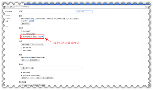 2、選中啟動(dòng)時(shí)選項(xiàng)中的"打開特定網(wǎng)頁(yè)或一組網(wǎng)頁(yè)"然后點(diǎn)擊后面的設(shè)置網(wǎng)頁(yè);