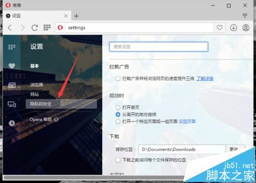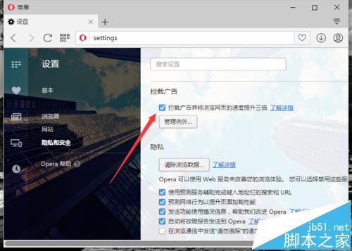 6、在“隱私和安全”選項卡的右側窗格,找到“攔截廣告”下的“攔截廣告并將瀏覽器網頁的速度提升三倍”選項并將其勾選。如圖所示;