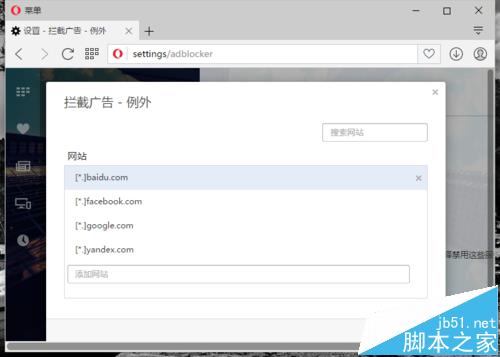 7、如果有特殊的一些網址不進行攔截,點擊“管理例外”。在攔截廣告-例外中下填寫相應的網址即可。如圖所示;
