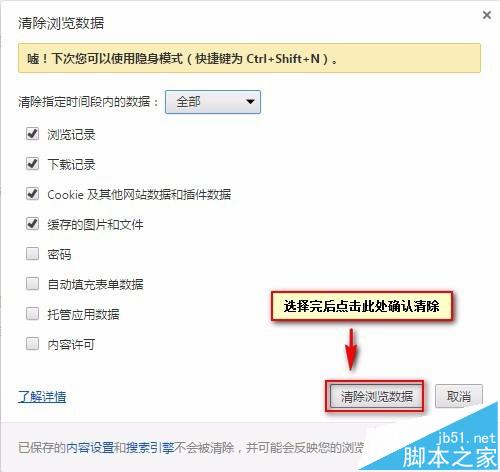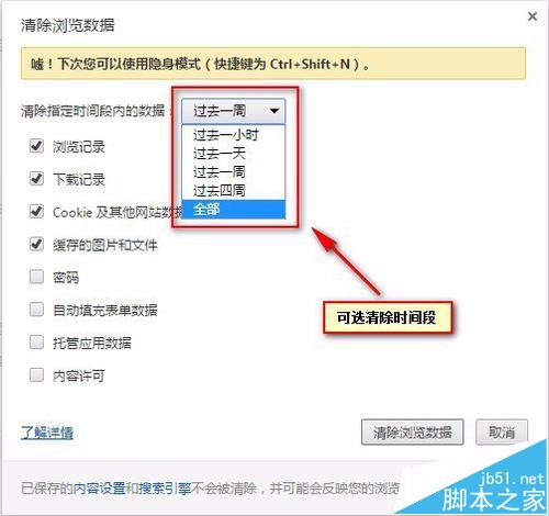 6、如果要清空所有瀏覽數據,可以在下拉欄中指定清除多少時間段內的數據,選擇最下面的一項即為清除全部數據