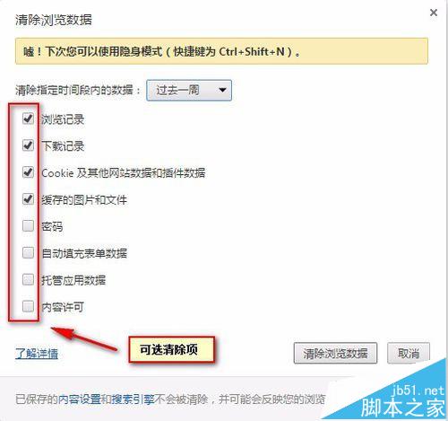 5、顯示清除瀏覽數據窗口,窗口左邊的多項選擇可以勾選想要清除的數據項