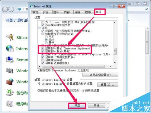 3、在高級(jí)選項(xiàng)界面,從“設(shè)置”列表中,找到“禁用調(diào)式腳本(Internet Explorer)”和“禁用調(diào)式腳本(其它)”,將這兩項(xiàng)勾選,確定,