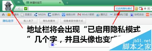 4、這時,將會新打開一個瀏覽器窗口,并且該窗口的地址欄有“已啟用隱私模式”幾個字,而且頭像圖標也變成了一個戴墨鏡的俠客。