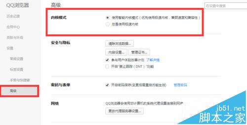 2、打開瀏覽器設(shè)置后,點(diǎn)擊左側(cè)【高級】選項(xiàng),然后有一個(gè)【內(nèi)核模式】點(diǎn)擊這里就可以自由進(jìn)行切換了。