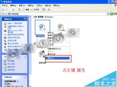 2、這里我用的是無線連接,所以在【無線連接】圖標上點擊右鍵,選擇【屬性】。如果是網線連接上網,就在【本地連接】上點右鍵