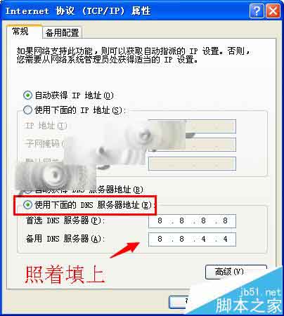 4、勾選【使用下面的DNS服務器地址】,分別填上8.8.8.8和8.8.4.4,保存確定即可。
