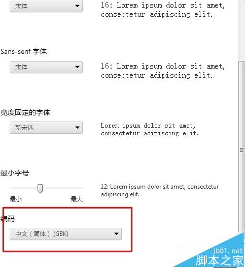 5、在彈出的窗口中找到最后一項“編碼”,一般來說,默認的都是“中文(簡體)(GBK)”,我們點擊右邊的小箭頭,在下拉列表中找到“Unicode UTF-8”,選擇它,并確定,重啟瀏覽器后,默認編碼格式就編程了UTF-8了,UTF-8是萬國碼,用它就不會出現亂碼了。