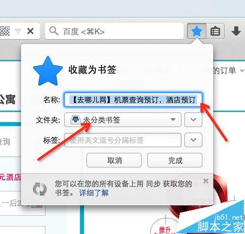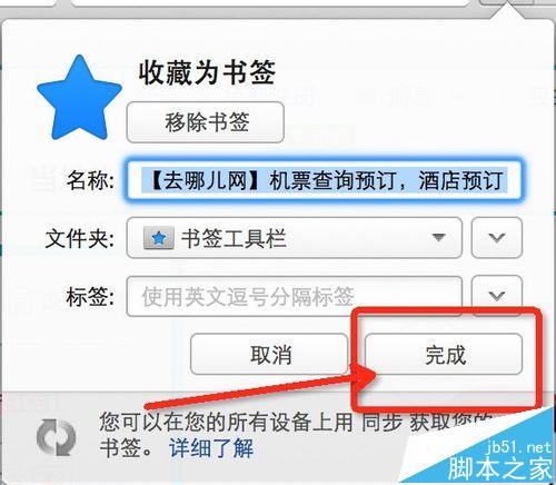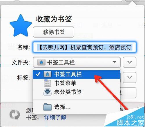 4、看到這里顯示,這個網頁收藏為書簽。名稱改成你自己容易記住的。然后下面的文件夾建議選擇一個方便的。這里小編推薦文件夾選擇“書簽工具欄”,如果這是你經常使用的網站,放在工具欄上是最方便的。