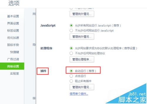 4、繼續找到“插件”,這里我們看到默認是自動運行。