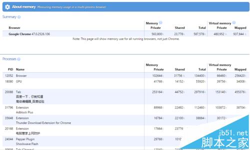 3、在打開的Chrome的任務(wù)管理器窗口中,我們可以查看到各個組件(例如,瀏覽器主進程、插件、擴展程序等)分別占用多少內(nèi)存。