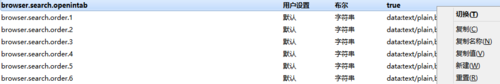 3、單擊后,就進入了設置頁面,里面很多項目,按照英文字母的順序找到“browser.search.openintab”,如圖所示:
