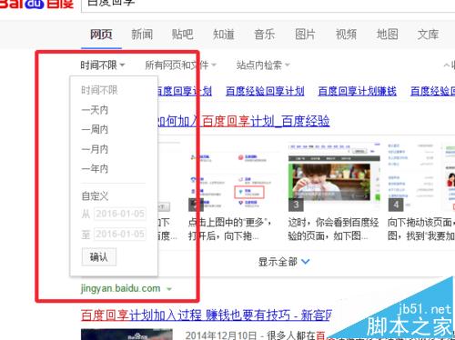 4、我們點擊時間不限,會出現一個下拉列表。從上到下有:一天內,一周內,一月內,一年內,還有自定義時間,自己可以填xx-xx-xx格式的2個時間進去。