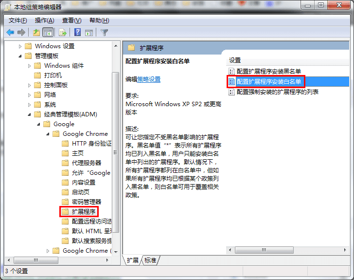 5. 依次展開 本地計算機策略 > 計算機配置 > 管理模板 > 經典管理模板(ADM) > Google > Google Chrome > 擴展程序,雙擊右側的“配置擴展程序安裝白名單”;